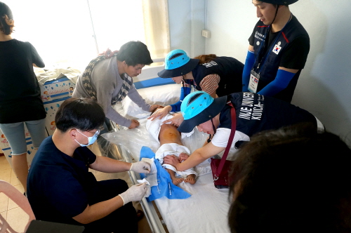 백병원 의료진은 싸이타니 군립병원에 마련된 진료소에서 3일간 700여명의 외래환자를 진료했다. 종양 환자 2명은 국소마취 수술로 종양을 제거했다. 봉사팀은 500여명의 개인위생세트와 치약·치솔도 전달했다. 인근 근처 초등학교 4곳에 구급함도 설치했다.