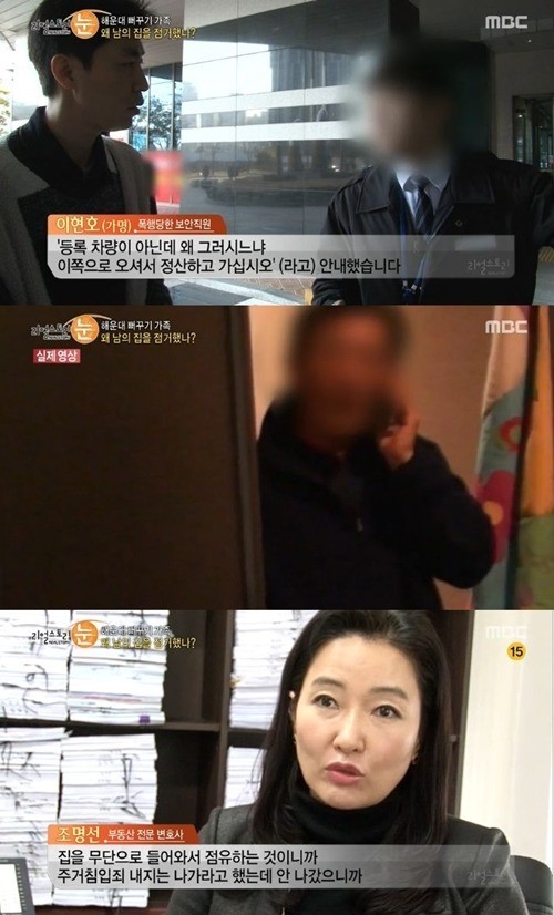 12일 오후 방송된 MBC 교양 프로그램 ‘리얼스토리 눈’은 약 6년 간 남의 아파트를 불법 점거하고 있는 해운대 뻐꾸기 가족을 다뤘다. 방송에 출연한 집주인은 “이 가족이 내 집을 무단 점유해 살고 있다”고 화를 냈다. 그러나 뻐꾸기 가족은 오히려 집주인에게 이사비용 2000만원을 달라고 하고 있는 상황. 현재 이 가족이 운영중인 옷가게 역시 월세를 내지 않고 상가를 무단 점유해 장사 중이며 최소 피해사례만 6~8건이라고 제작진은 밝혔다.