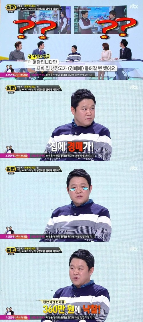 김구라는 “여담입니다만 우리집도 냉장고가 경매에 들어갈 뻔했다. 집안 가재도구에 경매가 들어왔다. 그래도 내가 낙찰을 받았다. 딱지를 붙이고 전체 가재도구를 360만원에 낙찰받았다”고 전했다.