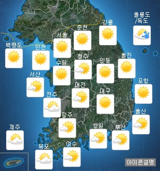 아침 최저기온은 서울 -6도, 대전 -4도, 부산 -2도, 대구 -3도, 광주 -2도 등으로 오늘보다 낮겠다. 낮 최고기온은 서울 3도, 대전 3도, 부산 7도, 대구 5도, 광주 5도 등이다.