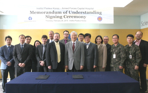 [쿠키뉴스=김단비 기자] 한국파스퇴르연구소와 국군수도병원은 지난 26일 경기도 판교테크노밸리에 위치한 한국파스퇴르연구소 대회의실에서 양해각서를 체결하고, 국군장병의 건강을 위협하는 감염성 질환 퇴치를 위한 연구개발에 협력키로 했다.