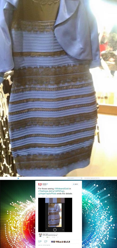 27일(한국시간) 오전 6시 텀블러 사용자 ‘Swiked’는 드레스 한 벌 사진을 올렸다. 이 사진에는 단순히 핀턱 디테일과 예쁜 레이스가 장식된 칵테일 드레스가 찍혀 있었다. 문제는 드레스 색깔이었다. 텀블러 이용자들은 이 드레스에 대해서 “예쁜 파란색 드레스”라고 평했다. 하지만 에 대한 반박 댓글이 달렸다. “흰색과 금색 아닌가요?”