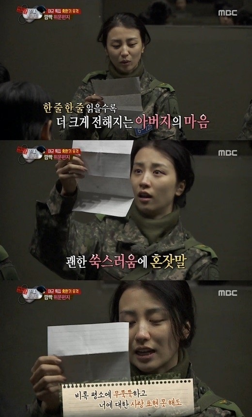 1일 방송된 MBC 예능 프로그램 ‘일밤-진짜사나이’에서는 박하선이 아버지의 위문편지를 받고 공개 낭독하는 모습이 전파를 탔다.
