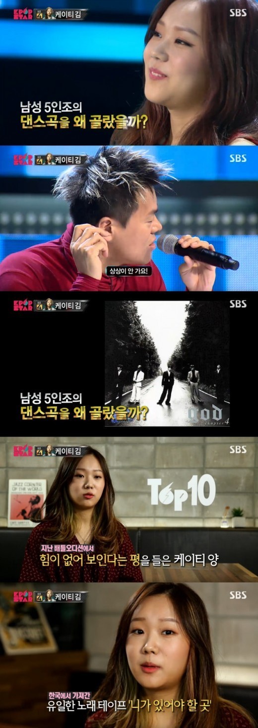 케이티김의 힘 있는 무대를 본 심사위원들은 극찬을 쏟아냈다. 기립박수를 친 박진영은 “술 마시고 올라왔느냐”며 “너무 잘해서 심사불가다. R&B음악에서 가장 중요한 것이 즉흥적인 애드리브인데, 그걸 잘 보여줬다. 그 장르 무대에선 ‘K팝스타’ 4년간 최고의 무대였다”고 평했다.