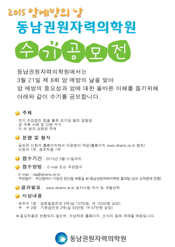 최우수상 1명에게는 동남권원자력의학원장상과 암정밀검진권(150여 만원 상당) 2매, 우수상 2명에게는 동남권원자력의학원장상과 종합검진권(50여 만원 상당) 각 2매 등이 수여된다.