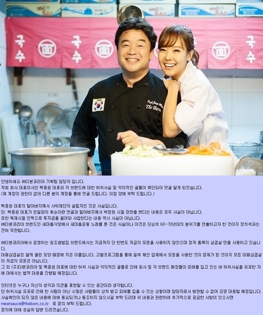 이날 온라인 커뮤니티에는 백 대표가 독재시절 권력가의 후손이며 그가 운영하는 프랜차이즈 식당에서 품질이 낮은 식자재를 사용한다는 댓글이 올라와 논란이 일었다.