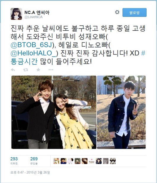 앤씨아는 지난 26일 자신의 SNS를 통해 새 싱글 앨범 ‘통금시간’ 뮤직비디오에 출연한 비투비 육성재와 헤일로 디노의 사진을 공개하며 “진짜 추운 날씨에도 불구하고 하루 종일 고생해서 도와주신 비투비 성재오빠, 헤일로 디노오빠 진짜 진짜 감사합니다! 통금시간 많이 들어주세요!“라며 감사를 표했다.