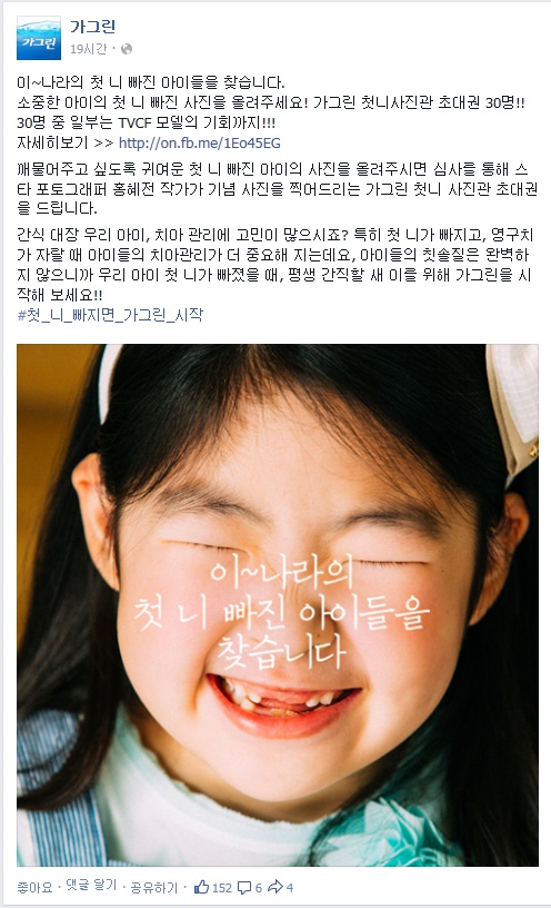 만 6세 전후의 첫 니 빠진 어린이들은 그 모습을 사진 찍어 ‘가그린’ 페이스북을 통해 이벤트에 참여 가능하다. 자세한 방법은 ‘가그린’ 페이스북(www.facebook.com/garglin.dapharm)을 참고하면 된다.