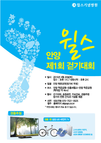 [쿠키뉴스=김단비 기자] 안양 윌스기념병원이 오는 25일(토) 학운공원에서 제1회 안양 윌스 걷기대회를 개최한다.