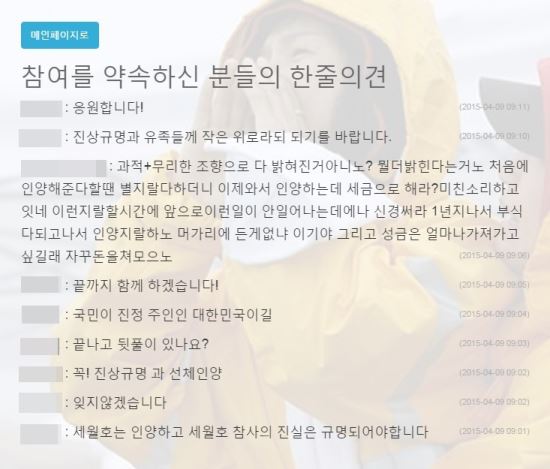 ‘세월호 기네스북’ 사이트 ‘참여를 약속하신 분들의 한 줄 의견’ 페이지에는 9일 “좀 그만 나대고 선동질하지 마라. 이런다고 죽은 아이들이 돌아오느냐?” “바퀴벌레들 4월26일 날 광화문에 모여 다 타죽었으면 좋겠다” “어지간히 좀 해라. 지겹지도 않느냐” 등의 유가족을 향한 비난과 고(故) 노무현 전 대통령을 비하하는 글이 집중적으로 올라왔다.