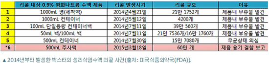 가장 최근에 진행된 리콜은 지난 3월 18일 시작된 것으로 제품의 무균상태가 의심되는 용기의 봉합과 누액 관련 불량사례가 FDA에 접수된데 따른다.