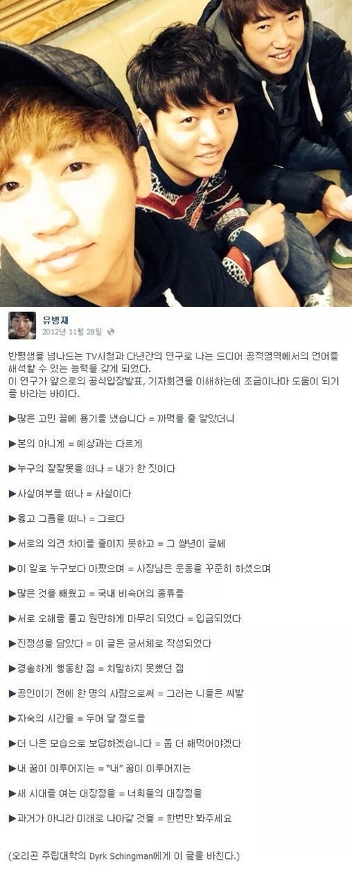 ‘옹달샘’의 장동민·유세윤이 사과문을 내보냈는데도 과거의 발언들이 계속 회자되고 있습니다. 시청자들은 계속해서 이들이 출연하는 프로그램 시청자 게시판에 하차를 요구합니다. 그 원인은 무엇일까요. 멀리 갈 것도 없이 사과문만 봐도 답이 나옵니다. 지난해 작가 겸 방송인 유병재의 ‘사과문 해석법’이 화제가 된 바 있죠. 장동민의 공식 사과문을 먼저 유병재식으로 해석해본다면 이런 답이 나옵니다.