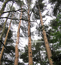 재선충병은 0.6∼1㎜ 크기의 머리카락 모양 재선충이 나무조직 내에 살면서 소나무의 수분이동 통로를 막아 나무를 고사시키는 병으로 감염되면 치료방법이 없다.