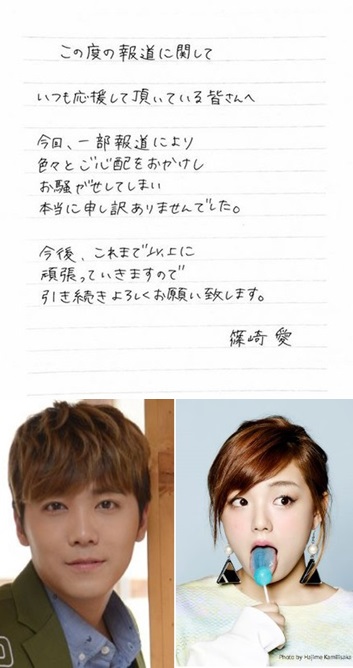 [쿠키뉴스=이은지 기자] 일본 가수 겸 배우 시노자키 아이(23)가 밴드 FT아일랜드 멤버 이홍기(25)와 불거진 열애설에 대해 팬들에게 친필 편지로 사과했다.