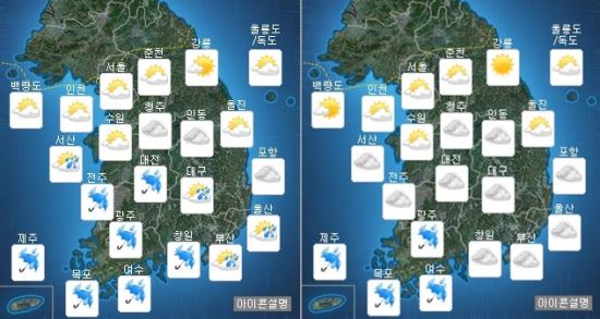 아침 최저기온은 서울 15도, 대전 14도, 부산 15도, 대구 15도, 광주 14도 등이며 낮 최고기온은 서울 26도, 대전 25도, 부산 21도, 대구 23도, 광주 22도 등이다.