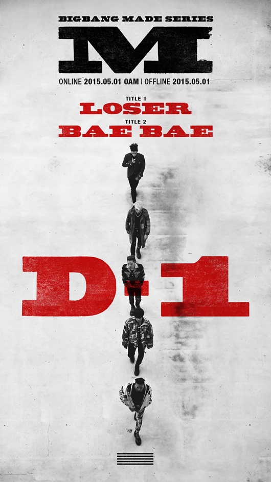 흑백 사진으로 된 M 포스터에는 빅뱅의 다섯 멤버들이 어디론가 걸어가는 모습이 담겨 있다. 사진 위로는 빅뱅의 타이틀곡인 ‘루저(LOSER)’와 ‘배배(BAE BAE)’와 함께‘D-1’이라는 문구가 쓰였다.