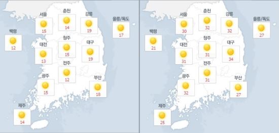 아침 최저기온은 서울 15도, 대전 13도, 부산 17도, 대구 19도, 광주 15도 등으로 어제와 비슷하겠고 낮 최고기온은 서울 30도, 대전 31도, 부산 27도, 대구 34도, 광주 33도 등으로 어제보다 조금 높겠다.