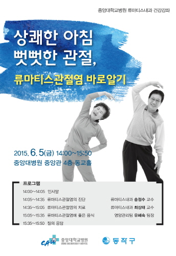 ‘상쾌한 아침 뻣뻣한 관절, 류마티스관절염 바로알기’라는 주제로 진행되는 이번 건강강좌는 ▲류마티스관절염의 진단(류마티스내과 송정수 교수) ▲류마티스관절염의 치료(류마티스내과 최상태 교수) ▲류마티스관절염에 좋은 음식(영양관리팀 유혜숙 팀장) ▲질의응답 순서로 진행된다.
