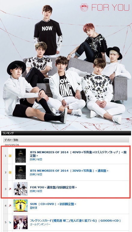 지난 27일 일본 타워레코드 예약 판매 차트에서 방탄소년단의 공연 실황을 담은 한정판 DVD ‘BTS Memories of 2014’가 차트 1위에 올랐다. 또 일반판은 2위에, 오는 6월 발매되는 방탄소년단의 싱글 음반 ‘포 유(For You)’가 차트 3위에 랭크됐다. ‘포 유’는 방탄소년단이 일본에서 네 번째로 선보이는 싱글로. 동명의 타이틀곡과 일본어로 부른 ‘호르몬 전쟁’ ‘렛 미 노우(Let Me Know)’등 3곡이 담길 예정이다.