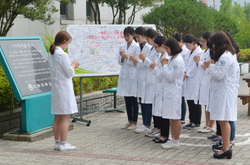 16일 건양대 대전캠퍼스 간호대학 로비에는 메르스 환자를 살리려다 감염된 간호사의 쾌유를 기도하기 위해 간호학과에 재학중인 20여명의 학생들이 한 자리에 모였다.