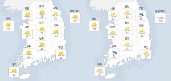 아침 최저기온은 서울 23도, 대전 21도, 부산 22도, 대구 23도, 광주 21도 등이고 낮 최고기온은 서울 33도, 대전 32도, 부산 28도, 대구 30도, 광주 32도 등이다.