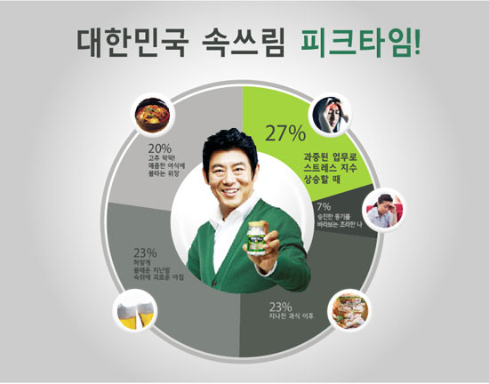 설문 결과 전체 응답자의 27%가 ‘과중한 업무로 스트레스 지수가 상승 할 때’를 가장 속쓰림이 심한 순간으로 꼽았다. 이어 ‘지나친 과식’(23%)과 ‘고추 팍팍! 매콤한 야식에 불타는 위장’(23%) 등이 속쓰림이 심한 순간이라고 나타났다.