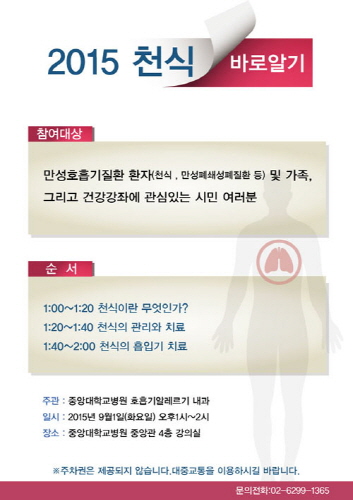 이번 강좌는 천식이나 만성폐쇄성폐질환 등 만성호흡기질환을 앓고 있는 환자나 이러한 질환에 관심 있는 사람은 누구나 사전 예약없이 참석할 수 있으며, 강좌와 관련한 자세한 문의사항은 중앙대병원 호흡기알레르기내과(02-6299-1365)로 연락하면 된다. kubee08@kukimedia.co.kr