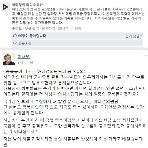하 의원의 비판에 이 시장은 다시 페이스북을 통해 “님의 종북 과거와 님 소속 집단이 북에 돈주고 총격유도 시도한 종북행위를 사과할 용의가 있는지 묻습니다”라며 ‘종북몰이 나서는 하태경의원님께 공개질의’라는 제목의 글로 맞받아 SNS와 인터넷을 달궜다.