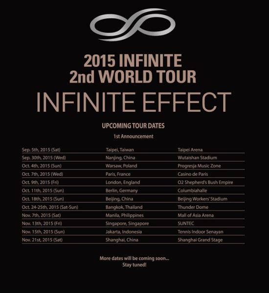 25일 소속사 측에 따르면 지난 8일과 9일 양일간 서울 공연을 성황리에 마무리한 인피니트는 다음달 5일 대만 ‘타이페이 아레나(Taipei Arena)’에서 열리는 대만 공연을 시작으로 ‘2015 인피니트 이펙트(INFINITE EFECT)’ 월드투어 대장정에 오른다.