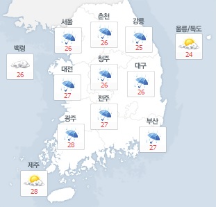 낮 최고기온은 24∼28도로 전날과 비슷하거나 조금 낮겠다.