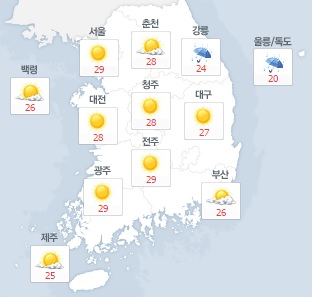 낮 최고기온은 23도에서 29도로 전날과 비슷하거나 조금 높겠다.