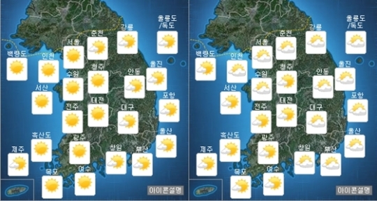 [쿠키뉴스=민수미 기자] 일요일인 20일은 발해만 부근에 있는 고기압의 영향을 받아 전국에서 대체로 맑다가 오후에 가끔 구름이 많겠다.
