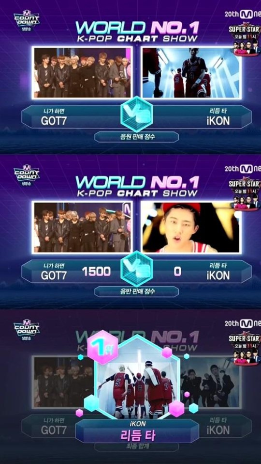 아이콘은 8일 방송된 음악방송 ‘엠카운트다운’에서 ‘리듬 타’로 그룹 갓세븐의 ‘니가 하면’을 제치고 1위를 거머쥐었다. 이날 아이콘은 출연하지 않았다.