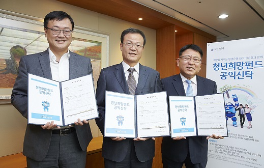 "[쿠키뉴스=구현화 기자] IBK기업은행은 백복인 KT&G 대표이사(가운데) 등 임원 51명이 서울 강남구 KT&G 서울본사에서 7000만원을 모아 기업은행을 통해 청년희망펀드 공익신탁에 가입했다고 20일 밝혔다.