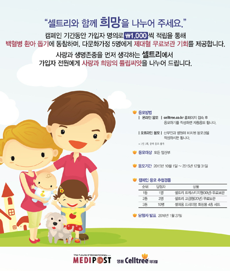 이번 캠페인은 10월 1일부터 12월 31일까지의 자사 제대혈은행 가입자 수에 따라 일정 금액을 메디포스트가 적립, 가입자 명의로 백혈병어린이단체에 기부하는 방식으로 진행된다.