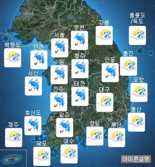 [쿠키뉴스=민수미 기자] 화요일인 27일은 전국이 흐리고 비(강수확률 70∼90%)가 내리다가 중국 중부지방에서 확장하는 고기압의 영향을 받아 오후에 서쪽지방부터 점차 맑아지겠다.