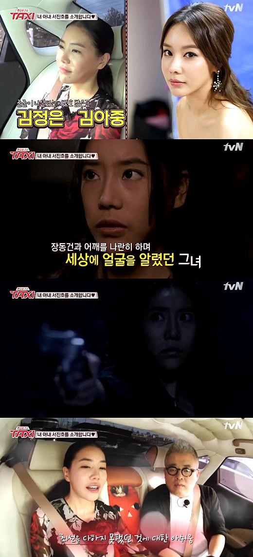 27일 방송된 케이블채널 tvN ‘현장토크쇼 택시’에는 작곡가 김형석, 배우 서진호(39) 부부가 출연했다. 두 사람의 예능 동반 출연은 처음으로, 서진호의 경우 카메라 앞에 서는 것이 오랜만이다. 다소곳한 모습을 보인 서진호는 “김형석 색시”라고 자신을 소개했으나 김형석은 “평소에는 무섭다”고 말해 웃음을 자아냈다.