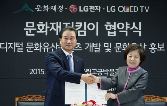 LG전자와 문화재청은 27일 서울 고궁박물관에서 ‘문화재지킴이’ 협약식을 갖고 우리 문화재의 아름다움과 가치를 지속적으로 알려 나가기로 했다. 협약식에는 LG전자 한국영업본부장 최상규 사장, 나선화 문화재청장 등이 참석했다.