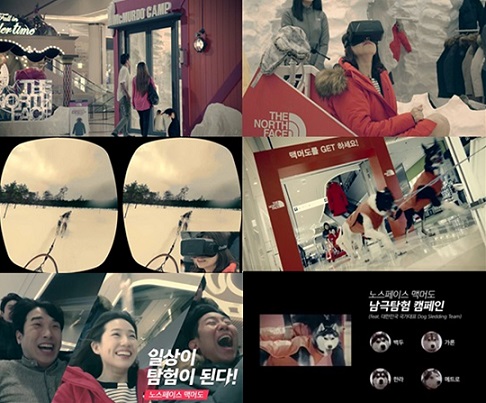 노스페이스의 ‘맥머도 남극탐험’ 캠페인 영상에 등장하는 고객들은 남극 최대 관측 기지인 맥머도 캠프 형태의 노스페이스 팝업 스토어에서 맥머도 다운재킷 신제품을 착용해 보고, 남극의 설원을 달리는 3D 가상현실 이벤트에 참여하게 된다. 고객이 가상현실에서 개썰매를 타고 남극의 설원을 누비는 찰나, 정지해 있던 개썰매는 팝업 스토어의 벽을 뚫고 도심 쇼핑몰 한복판을 질주하며 예상하지 못했던 짜릿한 탐험을 시작하게 된다.