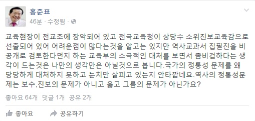 홍 지사는 29일 자신의 페이스북을 통해 “교육현장이 전교조에 장악되고 상당수 전국 교육청이 소위 진보교육감으로 선출돼 어려운 점이 많다는 것을 알고는 있다”고 밝혔다.