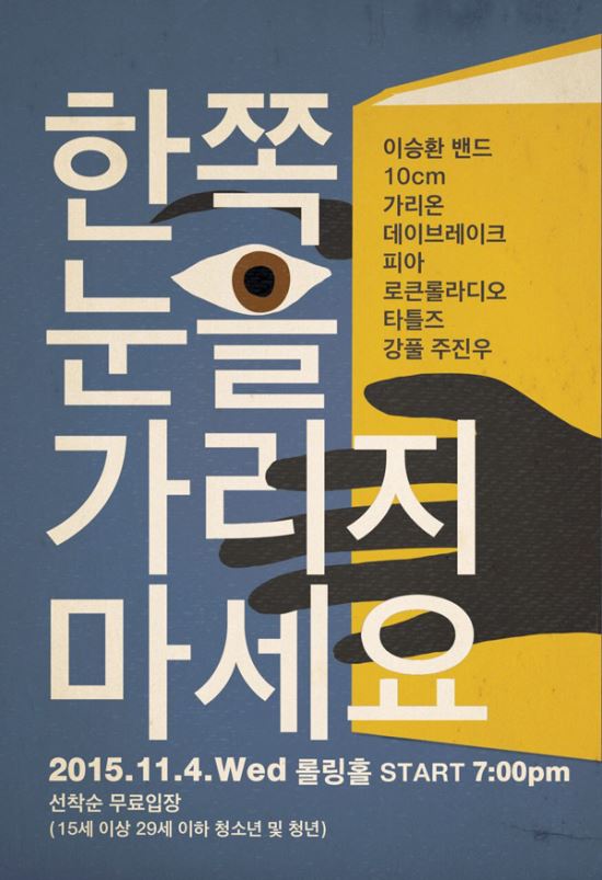 앞서 이승환은 역사 교과서 국정화 반대 콘서트를 4일 오후 7시 서울 어울마당로 롤링홀에서 연다고 밝혔다. 이 공연에는 10cm, 가리온, 데이브레이크, 피아, 로큰롤라디오, 타틀즈를 비롯해 웹툰작가 강풀, 주진우 기자가 참여한다. rickonbge@kmib.co.kr