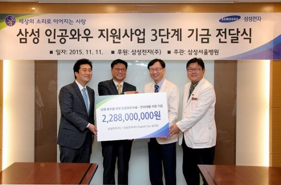 삼성전자 수원사회봉사단장 안재근 부사장 일행은 11일 삼성서울병원에서 권오정 원장과 만나 인공와우 수술 환아 가족을 격려하고 인공와우 수술과 재활치료를 지원하는 '삼성 인공와우 지원사업 3단계 기금 전달식'을 가졌다.