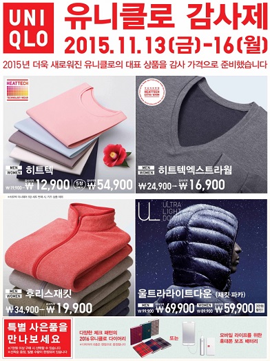 ‘유니클로 감사제’는 1년 중 가장 큰 규모로 시행하는 유니클로만의 독자적인 고객감사축제로, 2015년 더욱 새로워진 ‘히트텍(HEATTECH)’, ‘후리스(Fleece)’ 및 ‘울트라 라이트 다운(Ultra Light Down)’ 등 유니클로 대표 상품들을 파격적인 할인가에 제공한다.