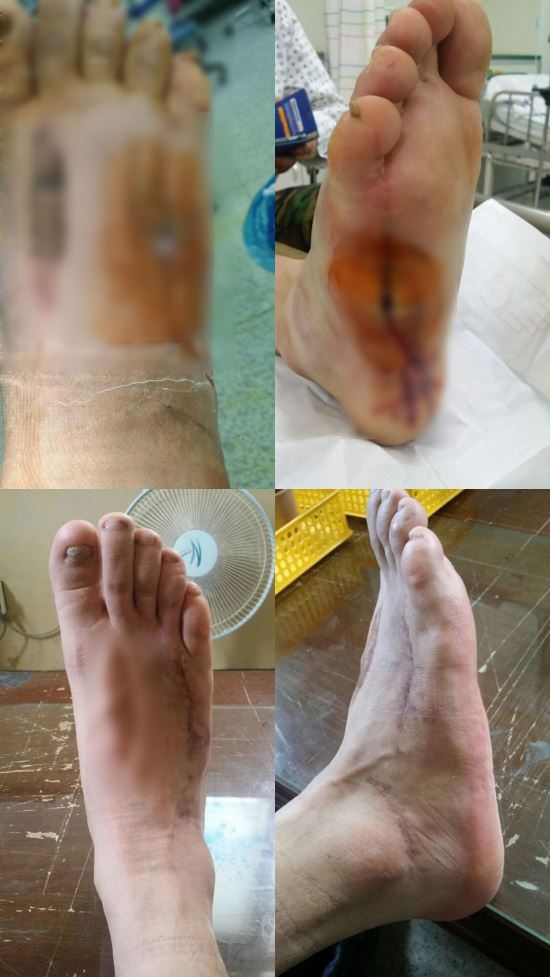 이 사고로 곽 중사는 우측 발바닥에 개방성 골절, 거골(목말뼈) 골절, 구획증후군 등으로 그해에만 4차례의 수술을 받아야 했습니다. 현재도 비복신경(장딴지 신경) 손상으로 인한 지속적인 다리 통증으로 불편을 겪고 있습니다.