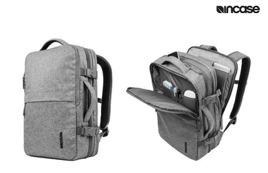 인케이스의 EO 트래블 백팩은, 1박 2일의 짧은 여행을 떠나는 여행자의 필요품에 넉넉한 수납공간과 액세서리/서류 등을 위한 여러 개의 수납포켓으로 효율적인 수납에 용이하다. 백팩의 사이드 지퍼를 열면 용량의 30%를 확장시킬 수 있다. EO 트래블 백팩에 내장된 IT 기기 전용 수납부는 사용자의 노트북, 아이패드 등을 인조모피 안감으로 안전하게 보호하며, 디바이스를 꺼내기 위해 가방 속을 흩트릴 필요가 없다. 특히 이 패드형 수납부는 기내 반입시 공항의 X레이 검색 대에서도 노트북을 꺼낼 필요 없이, 수납부를 펼친 상태에서 검색대를 통과할 수 있다.