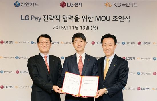 "[쿠키뉴스=구현화 기자] LG전자가 19일 여의도 트윈타워에서 신한카드, KB국민카드와 차세대 모바일 결제 서비스 ‘LG페이’를 위한 전략적 업무 제휴를 체결했다.