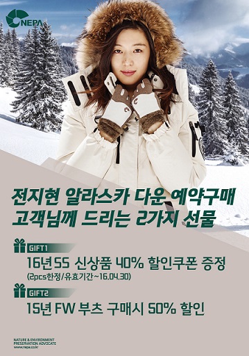 "[쿠키뉴스=구현화 기자] 아웃도어 브랜드 네파가 ‘알라스카 다운재킷’ 전지현 광고 제품 완판을 기념해 할인 혜택을 제공하는 예약구매 이벤트를 진행한다고 3일 밝혔다.
