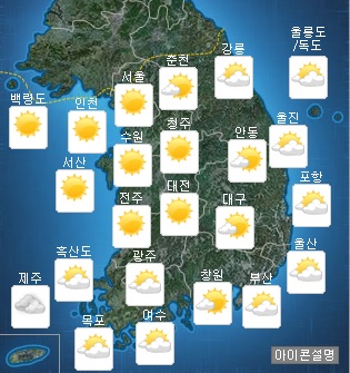 [쿠키뉴스=민수미 기자] 토요일인 12일은 중국 북동지방 고기압의 영향으로 전국이 대체로 맑겠다.