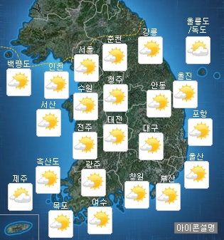 [쿠키뉴스=민수미 기자] 일요일인 13일은 중국 북동지방에 위치한 고기압의 영향을 받아 전국이 대체로 맑겠다.