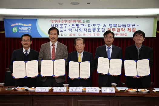 "[쿠키뉴스=구현화 기자] SK그룹의 사회공헌 전문 재단인 행복나눔재단은 16일 서울 서대문구청에서 문석진 서대문구청장, 김우영 은평구청장, 박홍섭 마포구청장, 김용갑 행복나눔재단 사회적기업 본부장, 최강종 행복도시락 사회적협동조합 이사장 등이 참석한 가운데 ‘서대문구·은평구·마포구 결식아동의 건강한 급식 지원 개선을 위한 업무협약(MOU)’을 체결했다고 밝혔다.